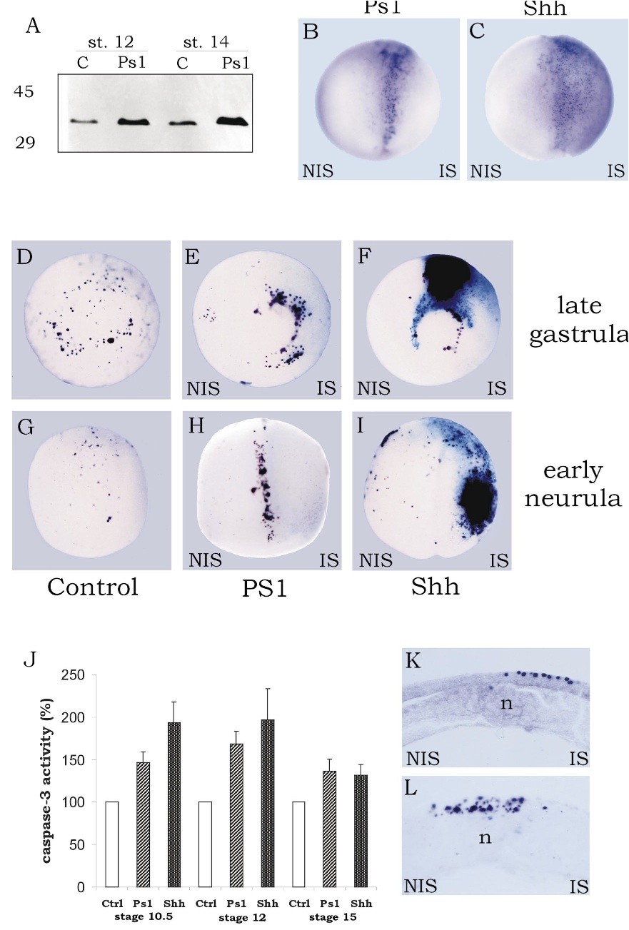 Fig. 3. Effects of presenilin and X-shh injection on proliferation and programmed cell death. (A) Western blot of PCNA at stage 12 (st. 12, gastrula) and stage 14 (st. 14, neurula). C, controls; Ps1, embryos bilaterally injected with Ps1 mRNA. One embryo equivalent was loaded per lane. Identical results were obtained from two independent experiments. On the left, molecular mass markers, in kDa. (B, C) Whole-mount inmunohistochemistry for PCNA after unilateral Ps1 (B) or X-shh (C) injection. Dorsal views of stage 14 embryos are shown; anterior is up. IS, injected side. NIS, non-injected side. (D) Ps1 and X-shh mRNA injection increased apoptosis. (D) Whole-mount TUNEL determination. Control embryos (D, G), embryos unilaterally injected with Ps1 (E, H) or X-shh mRNA (F, I). All are dorsal views. Anterior is up. The injected side (IS) is demarcated by the pale blue X-gal staining. NIS, non-injected side. (D) Stage 12 embryos. (G) Stage 15 embryos. (J) Caspase-3 activity determination. Embryos bilaterally injected with Ps1 or X-shh mRNA show an increased caspase-3 activity at stage 10.5 and at stage 12 (69% for Ps1, n ï° 3; 97% for X-shh, n ï° 3) when compared to controls (Ctrl, n ï° 4). Caspase-3 activity declines at neurula stages (stage 15). Values are expressed as percentage of the activity from control extracts; SEMs are indicated by error bars; n indicates the number of independent caspase-3 determinations, each consisting of extracts from 30 embryos. The observation that at neurulation TUNEL staining revealed strong signal while caspase-3 activity declined is consistent with the fact that caspase-3 activation precedes DNA fragmentation during apoptosis (Liu et al., 1997). (K) Cross-section of the embryo shown in (B). (L) Cross-section of the embryo shown in (H). n, notochord.