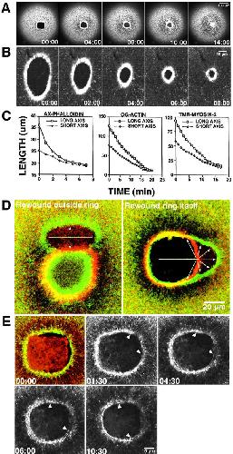 Figure 1. Wound-induced actomyosin arrays are contractile. All times are in min:sec. (A) Images from a 4D video of oocyte injected with TR-phalloidin and wounded with imaging laser to produce square wound. Wound rounds up during closure. See Video 1. (B) Images from 4D video of oocyte injected with AX-phalloidin and wounded twice with nitrogen pump laser to generate oval wound. Long axis of wound closes faster than short axis until both are same length. (C) Quantification of oval wound closure. Regardless of probe used, long axes shrink faster than short axes. (D) Fluorescent, color-coded images obtained from 4D videos of oocytes wounded after injection with OG-actin and rewounded either outside the actin ring (left), or on (right) the actin ring. The last image of the 4D video before rewounding is shown in red; the first image taken after rewounding is shown in green. The linear wound made outside the closing ring with a laser Z-scan (white line) is limited in its lateral spread (arrows), whereas the wound made to the ring itself results in the springing open of the ring and extensive lateral spreading (arrows). (E) Fluorescence images from a 4D video of an oocyte injected with AX-phalloidin and TR and then subjected to a âcauterizingâ wound (see text). The 00:00 time point is shown in green and red to reveal both the F-actin (green) and the presence of the cauterized region (red square on inside of wound). Subsequent time points show only the phalloidin signal. Closing actin ring breaks on right side of cauterized square and free edges (arrowheads) recoil away from break. See Video 2. The supplemental videos are available at http://www.jcb.org/content/vol154/issue4. |
