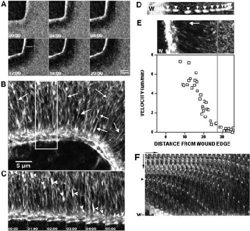 Figure 2. A vortex of cortical flow at the wound border. (A) Images from 4D video of wound closure in oocyte injected with AX-phalloidin. Stable F-actin flows from surrounding cortex to wound edge, creating dark halo of F-actin depletion (white line) that spreads from the original wound edge. See Video 3. (B) Image from a 4D video of wound closure in an oocyte injected with AX-phalloidin. Stable F-actin around wound edge is in cables oriented parallel to wound border, whereas peripheral F-actin forms cables oriented perpendicular to wound border (arrows). (C) Images representing boxed area in B. The perpendicular actin cables (arrowheads) flow toward wound edge. See Video 4. (D) Projection of 14, 1 min frames from a 4D video of F-actin particle moving to wound border (W). Over time, F-actin (arrowhead) moves increasing distances toward the wound. (E) Correlative plot of F-actin cable velocity versus distance from the wound. The fluorescence micrograph is taken from the 4D video used to generate the instantaneous velocity measurements shown in the graph; X-axis of the graph corresponds to the area from the micrograph where the measurements were made. Instantaneous velocity measurements show that F-actin more than â¼28 μm away from the wound moves slowly; in regions close to wound, rate of movement increases sharply until plateau near wound edge. The threshold distance is correlated with the transitional area between low and high cortical F-actin (gray line). (F) Kymograph of AX-phalloidinâlabeled actin motility at the wound edge. Horizontal arrow is 90 s; vertical arrow is 10 μm. Acceleration of F-actin as it approaches wound (W) is revealed by progressively greater distances moved over time by individual actin spots (arrowhead). The supplemental videos are available at http://www.jcb.org/content/vol154/issue4. |