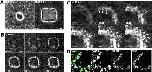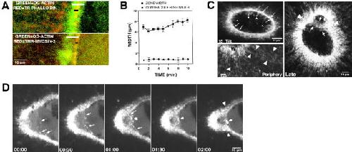 Figure 4. The contractile ring is contained within the zone of actin polymerization. (A) Double label images from 4D videos made of oocytes injected with OG-actin and either TR-phalloidin (top) or TMRâmyosin 2 (bottom). The TR-phalloidin and TMRâmyosin 2 (red) act as markers for the contractile array of F-actin, which forms a tight band (black bar) within the broader zone of polymerization revealed by the green OG-actin (white bar). (B) Quantification of zone and contractile ring width from 4D videos made of oocytes injected with both OG-actin and TR-phalloidin. Zone is â¼5 times broader than the contractile ring and increases in width over time. Results are mean ± SEM from three independent experiments. (C) Fluorescence images of F-actin distribution in wounded oocytes stained with phalloidin after fixation. A 15° tilt of an image of a 4-μm stack reveals cables of F-actin parallel to the wound border (arrows) as well as fingers of F-actin extending into the wound (arrowheads). An en face view of the periphery of the wound (periphery) made from a 1.2-μm stack reveals cables of F-actin running perpendicular to the wound border (arrowheads). An en face view made from an 8-μm stack of wound fixed late in healing process (late) reveals F-actin fingers contacting each other across wound (arrows) and apparently pulling the sides of wound together as revealed by indentations in the F-actin array around the wound (arrowheads). (D) Images from a 4D video of an oocyte wound in the late stages of healing. Fingers of F-actin (arrows) contact each other across the wound, shorten over time, and pull edges of wound together, causing indentations actin array around wound (arrow heads). In region of finger contact in middle of the wound, F-actin staining becomes progressively brighter (double arrowheads). See Video 8. The supplemental video is available at http://www.jcb.org/content/vol154/issue4. |