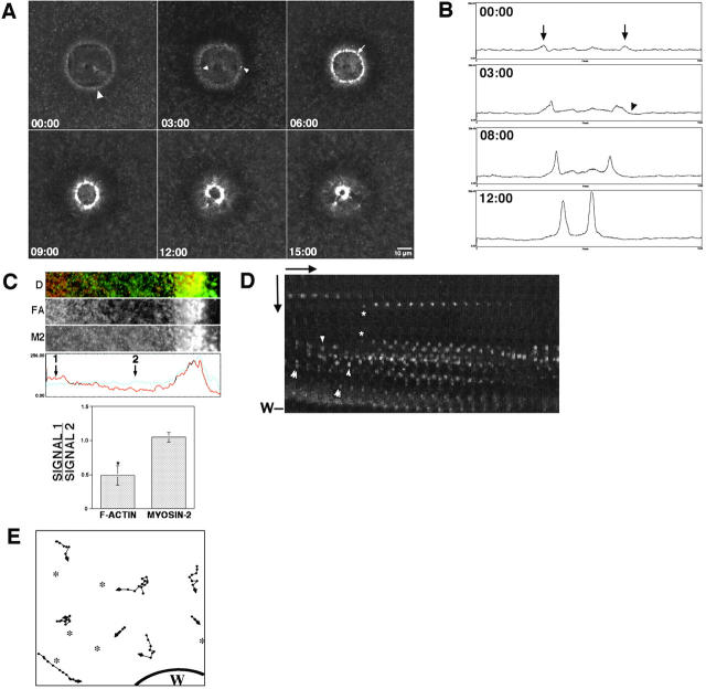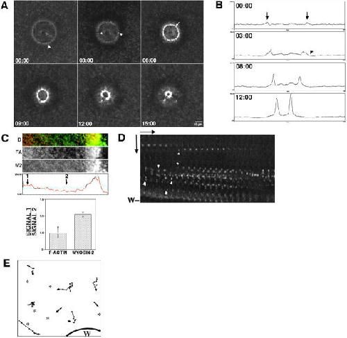 Figure 5. Myosin 2 accumulates around wounds with little obvious flow. Time shown is in min:sec. (A) Images from 4D video of oocyte injected with TMRâmyosin 2 and wounded. Bright foci of myosin 2 (arrowheads) accumulate around wound border and eventually fuse into tight, continuous ring (arrow). See Video 9. (B) Fluorescence intensity scans from 4D video images of wounds made in TMR-myosin 2âinjected oocyte. At start of imaging (00:00), peaks of myosin 2 signal (arrows) are evident flanking wound (W) even though no depletion of signal is seen in the flanking regions. Even at later time points, the signal trough (arrowhead) flanking signal peaks are quite limited relative to those seen with actin probes (compare to Fig. 3 B above). (C) Confocal, double-labeled image (D) of a wound edge stained for F-actin (FA) and myosin 2 (M2) with a corresponding signal intensity plot, where the red line is F-actin signal and the blue line is myosin 2 signal. Quantification of signal from region 1 (beyond the dark halo of depletion) versus region 2 (in the dark halo) shows that the degree of F-actin depletion in the dark halo is significantly greater than that of myosin 2 (results are mean ± SEM; asterisk indicates P < 0.05; n = 20 wounds from 3 experiments). (D) Kymograph of TMR-myosin motility at wound edge. Horizontal arrow is 45 s; vertical arrow is 10 μm. Some myosin 2 foci move toward the wound at the same rate as the edge moves forward (double arrowheads); some move backward (arrowheads) and some new foci appear during the course of imaging (asterisks). Few foci show acceleration toward the wound edge seen for F-actin (compare to Fig. 2 F). (E) Vector plot diagram of myosin 2 foci movement from Video 10. Each point is separated by 15 s; some foci move steadily toward wound (W), some move intermittently, and some move parallel to wound edge. Asterisks represent areas where foci appeared during the course of imaging. See Video 10. The supplemental videos are available at http://www.jcb.org/content/vol154/issue4. |