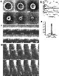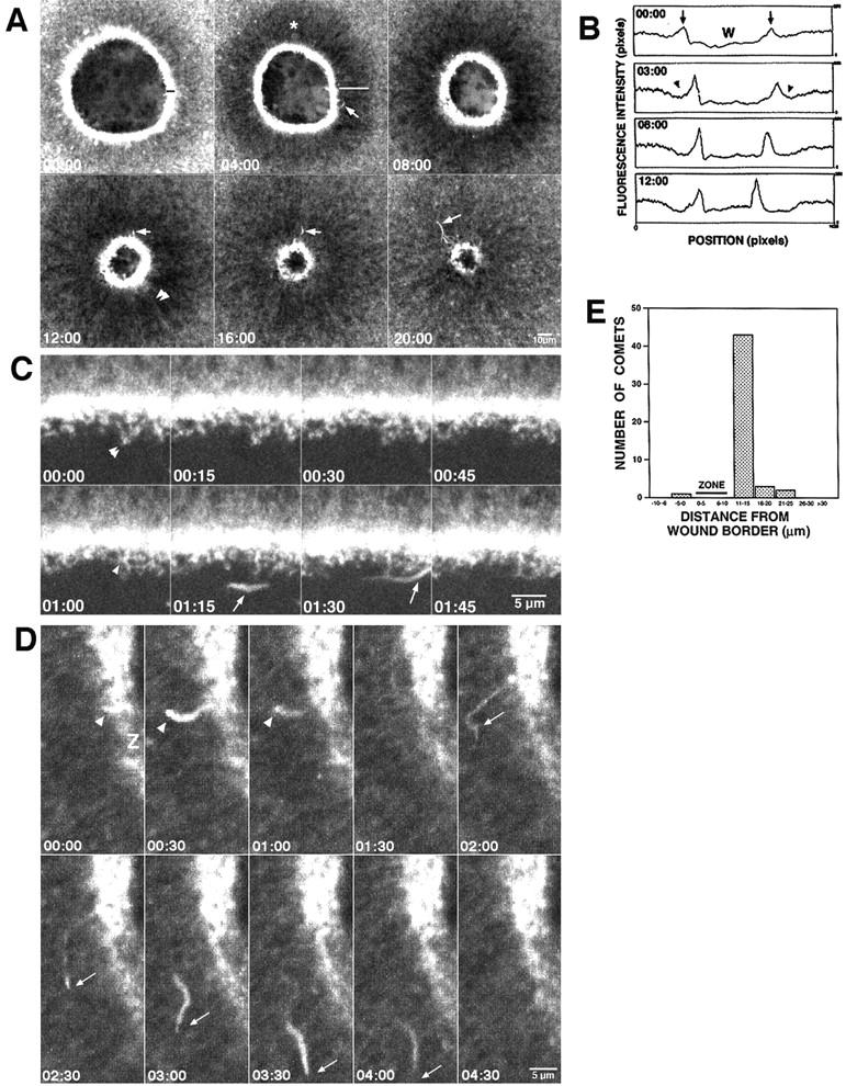 Figure 3. A zone of highly dynamic actin forms around wounds. (A) Images from a 4D video of oocyte injected with OG-actin and wounded. Actin is concentrated in an â¼6-μm wide zone around wound (black line) that broadens over time and is the site of actin comet formation (arrows). Zone is flanked by dark halo of F-actin depletion (white line). Radial actin cables run perpendicular to the wound border (arrowheads) and disappear into zone of intense actin accumulation. See Video 5. (B) Fluorescence intensity scans from 4D video images of wounds made in an OG-actinâinjected oocyte (note that imaging was started much sooner than in Fig. 3 A). At the start (00:00), peaks of F-actin signal (arrows) are evident next to wound (W) even though little depletion of signal is seen in flanking regions. However, at later time points, increasingly prominent signal âtroughsâ (arrowheads) flanking the peaks are evident. (C) Images from 4D video of oocyte injected with OG-actin and wounded. Wound edge is shown. Actin-rich âfingersâ (arrowhead) extend from zone of high actin signal and vanish within 1 min. Fingers often appear to contact each other (double arrowheads). An F-actin comet (arrow) swims lazily through wound area. See Video 6. (D) Images from 4D video showing comets form in or near zone of high actin density (Z). Comets typically taper at one (arrowhead) or both (arrows) ends. See Video 7. (E) Histogram showing relationship between comet position and the zone of high actin intensity. Individual comets that moved more than two frames were followed in 10 experiments. The supplemental videos are available at http://www.jcb.org/content/vol154/issue4. |