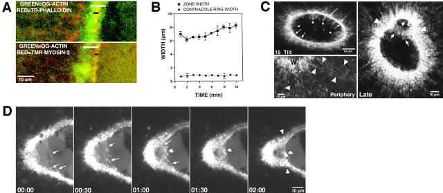 Xenopus oocytes assemble an array of F-actin and myosin 2 around plasma membrane wounds. We analyzed this process in living oocytes using confocal time-lapse (four-dimensional) microscopy. Closure of wounds requires assembly and contraction of a classic "contractile ring" composed of F-actin and myosin 2. However, this ring works in concert with a 5-10-microm wide "zone" of localized actin and myosin 2 assembly. The zone forms before the ring and can be uncoupled from the ring by inhibition of cortical flow and contractility. However, contractility and the contractile ring are required for the stability and forward movement of the zone, as revealed by changes in zone dynamics after disruption of contractility and flow, or experimentally induced breakage of the contractile ring. We conclude that wound-induced contractile arrays are provided with their characteristic flexibility, speed, and strength by the combined input of two distinct components: a highly dynamic zone in which myosin 2 and actin preferentially assemble, and a stable contractile actomyosin ring.