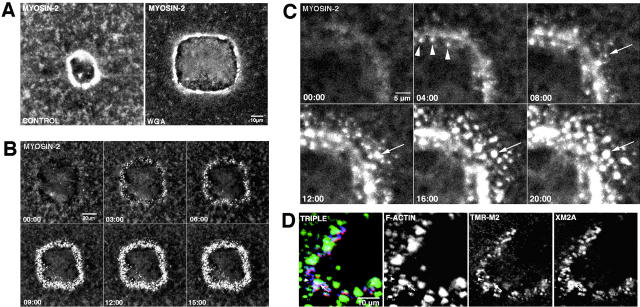 Figure 7. Uncoupling myosin assembly from cortical contraction and cortical flow. (A) Images from 4D videos made from oocytes injected with TMRâmyosin 2 and wounded. After 10 minutes, the control wound (control) has rounded up, commenced closure, and assembled a smooth, continuous ring of myosin 2. In contrast, the wound from oocyte treated with 100 μg/ml WGA was not rounded up nor closed, yet myosin 2 accumulated around the wound border in an irregular, discontinuous array. (B) Images from oocyte injected with TMRâmyosin 2 and then wounded after treatment with 40 μm cytochalasin B. Bright foci of myosin 2 accumulate over time around wound border, but fail to coalesce into a continuous ring. (C) High magnification images from a 4D video of oocyte injected with TMRâmyosin 2 and wounded after cytochalasin treatment. At the start of imaging (00:00), myosin 2 is visible as faint band. Bright foci of myosin appear adjacent to this band (arrowheads), and band is eventually surrounded by a â¼5â10-μm zone of myosin 2 foci (20:00). Most individual myosin 2 foci (e.g., arrow) grow progressively larger over time in the absence of any apparent transport. See Video 11. (D) Triple-label, confocal fluorescence analysis showing F-actin (green), TMRâmyosin 2 (red), and endogenous myosin 2A (blue) in oocytes wounded after pretreatment with cytochalasin. TMRâmyosin 2 (TMR-M2) and endogenous myosin 2A (XM2A) are codistributed around the wound. In some cases, they overlap with F-actin which remains after cytochalasin treatment (arrow), but in other cases they do not (arrowhead). The supplemental video is available at http://www.jcb.org/content/vol154/issue4. |