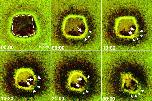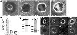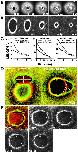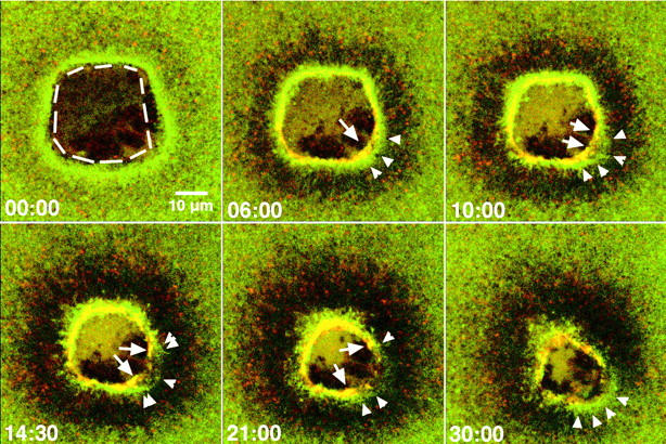 Figure 8. Breakage of the contractile ring destabilizes the zone of actin polymerization. Double-label images from 4D video of oocyte injected with OG-actin and TMRâmyosin 2 and then subjected to cauterization wounding. See Video 12. Hatched line indicates burnt area of cytoplasm. Initially actin is present around wound as typical zone of polymerization. 6 min after start of imaging cortical flow has commenced, as revealed by development of dark halo around wound. The contractile ring is visible as a tight red-yellow ring within broader green zone of polymerization. The ring encounters edge of cauterized cytoplasm (arrow), stops movement, and begins to stretch. The zone of actin polymerization is broader in this region (arrowheads). By 10 min the contractile ring has broken, two recoiling free edges are visible (arrows) and zone widens and dims locally near break. At later time points (14:30) the edge of the spreading zone (arrowhead) is only barely visible near the original break site, whereas the spreading itself (double arrowheads) is apparently following the retreating free edges of the broken contractile ring (arrows). By 21 min the zone is almost gone near the original break point, but by 30 min, a new zone has assembled (arrowheads). The supplemental video is available at http://www.jcb.org/content/vol154/issue4. |