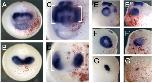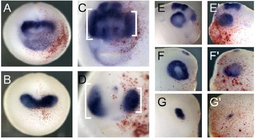 (blue staining) in Mo-X-DG-injected embryos at stage 14 (A, B), 25 (C, D) and 28 (E�GV). Nuclear beta-gal staining (red) was used to trace the side of injection. Panels