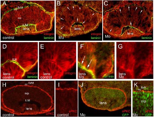 stage 32. The injected side in panels J and K was traced by GFP. Laminin and integrin were co-detected (yellow signal) in the Bruch�s membrane (BrM) at the bases