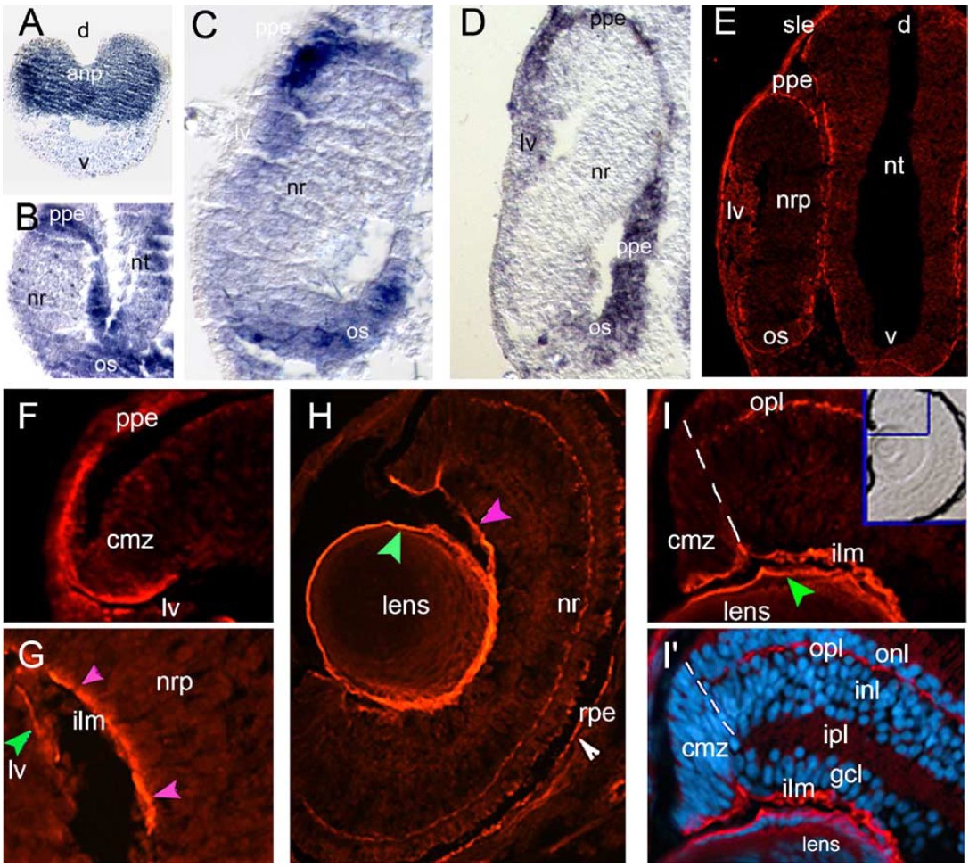 retina; nrp, neural progenitors; lv, lens vesicle; d, dorsal; v, ventral; nt, neural tube; sle, sensorial layer of ectoderm; cmz, ciliary marginal zone; gcl, ganglion cell