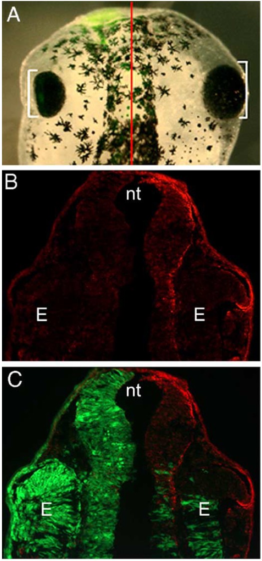 uninjected, control side (right). (B, C) Transversal section of a stage 32 injected