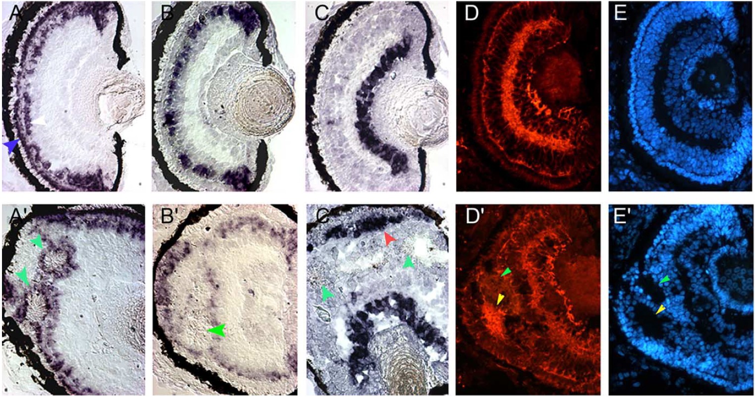 panels D and DV. In panel A, blue and white arrowheads indicate photoreceptors and bipolar cells. Green arrowheads show rosette-like structures. Red arrowhead