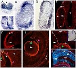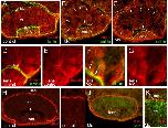 Fig. 4. Cryostat sections of Xenopus retina immunolabeled with polyclonal antibody against Lam1 (A�D and F: green labeling); monoclonal antibody against h1-