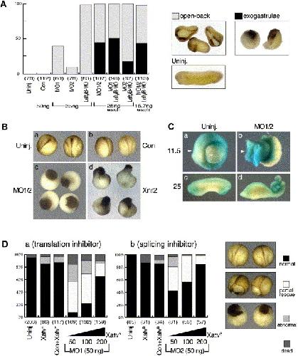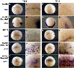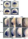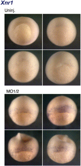 Supplemental Fig. 2. Expression of Xnr1 in XatvMO1 super + MO2-injected embryos. XatvMO1 and XatvMO2 (30 ng each) were injected at 1-cell stage. Xnr1 expression was analyzed by whole-mount in situ hybridization. Upper panel shows uninjected embryos at stage 10.5 (n = 5/5). Dorsal view. Lower panel shows XatvMO1+ XatvMO2-injected embryos (n = 7/7). Dorsal view. Note the limited expansion of Xnr1 expression in Xatv-deficient embryos, such as that of Xnr2 expression.