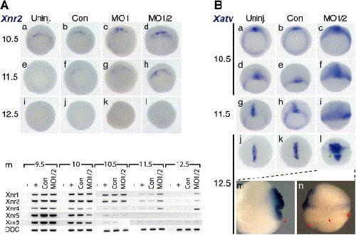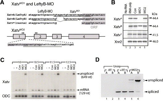 Fig. 1. Specific inhibition of Xatv translation and splicing with morpholino oligonucleotides. (A) Xatv MO positions relative to the translational start sites on Xatv mRNAs (XatvMO1 and leftyB-MO) and the exon 1/intron 1 junction on Xatv genomic DNA (XatvMO2); see Materials and methods for actual MO sequences (reverse complements of those shown here). (B) XatvMO1 inhibits the translation of XatvA in vitro. While translation of XatvA is completely inhibited by XatvMO1, XatvB translation is not blocked (lane 4). Xatv* rescue RNA translation is not affected by XatvMO1 (lane 4). Neither control MO nor XatvMO2 affects translation of Xatv mRNAs (lanes 3, 5). Translation of Xnr2 RNA is used as both loading control and negative control. (C) XatvMO2 specifically inhibits Xatv pre-mRNA splicing (embryos received 50 ng of each XatvMO and were collected at the indicated stages). Primers in panel A (arrows) amplify across intron 1 using unspliced XatvA and XatvB pre-mRNA. (D) XatvMO2 preferentially inhibits XatvB pre-mRNA splicing. Embryos injected with 50 ng of XatvMO2 were collected at stage 10.5. RT-PCR was performed with A or B primer sets that amplify XatvA or XatvB pre-mRNA, respectively; see Materials and methods for primer sequences.