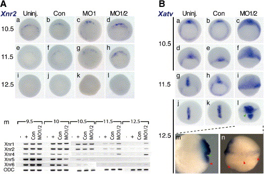 Fig. 3. Xatv depletion increases and prolongs Xnr expression levels and Xnr signaling. (A) XatvMO1 + MO2-injection upregulates and maintains Xnr1 and Xnr2 expression during gastrulation. (a–l) In situ hybridization (vegetal pole views) with Xnr2 in (a, e, i) uninjected or (b, f, j) control MO (60 ng)-injected embryos compared to those injected with (c, g, k) XatvMO1 alone (60 ng). [Quantitative analysis of alterations shown: c, n = 5/5; g, n = 6/6; k, n = 8/8.] (d, h, l) XatvMO1 + MO2 (30 ng each; quantitation: d, n = 14/15; h, n = 10/13; l, n = 13/13). Note the stronger Xnr2 signal in XatvMO1 + MO2-injected embryos than in XatvMO1-injected embryos. (m) RT-PCR with total RNA from whole embryos injected with 60 ng control MO, or 30 ng of each XatvMO1 and XatvMO2 (− RT, + RT controls are from uninjected embryos). (B) Xatv expression is increased and expanded in XatvMO1 + MO2-injected embryos during gastrulation. (a–c) Vegetal views. (d–l) Dorsal views. [Quantitation: c, n = 13/15; i, n = 21/23, l, n = 13/15.] (m, n) XatvMO1 + MO2-injected embryos at St. 12.5 were bisected longitudinally through the center of the Xatv expression domain after whole-mount in situ hybridization and viewed either (m) internally or (n) externally (green arrowheads, indentation of the superficial layer (see text); red arrowheads, epiboly margin).