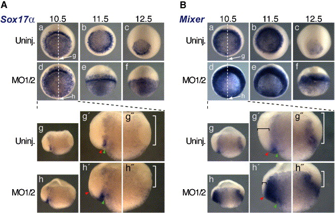 Fig. 5. Xatv is required for normal endoderm fate specification. (A) In situ hybridization with Sox17α in uninjected and XatvMO1 + MO2-injected embryos during gastrulation. (a–c) Uninjected embryos. (d–f) XatvMO1 + MO2-injected embryos. (a–d) Vegetal view, dorsal upwards. [Quantitative analysis of alterations shown: d, n = 6/6.] (e, f) Lateral view. [Quantitation: e, n = 8/8; f, n = 9/10.] (g, h) Sox17α expression at St. 10.5 detected by in situ hybridization after bisection through the center of the dorsal lip of (g) uninjected (n = 10/10) and (h) XatvMO1 + MO2-injected (n = 9/10) embryos (dorsal to the left). (g′, h′) Magnified views, dorsal side of panels g and h, compared to (g′′, h′′) magnified ventral side views. (B) Mixer expression in (a–c) uninjected and (d–f) XatvMO1 + MO2-injected embryos during gastrulation. (a–e) Vegetal view, dorsal to the top. [Quantitation: d, n = 6/6; e, n = 8/8.] (f) Lateral view (n = 8/8). (g, h) Mixer expression at St. 10.5 detected by in situ hybridization after bisection through the center of the dorsal lip of (g) uninjected (n = 8/8) and (h) XatvMO1 + MO2-injected (n = 10/10) embryos (dorsal to the left). (g′, h′) Magnified views, dorsal side of g and h compared to (g′′, h′′) magnified ventral views. Green arrowheads: dorsal lip. Red arrowheads: most animal/anterior expression limit of Sox17α (A) and Mixer (B). White brackets: separation of blastocoel floor from the edge of Sox17α (A) and Mixer (B) expression domains in the superficial layer. Black brackets: breadth of Mixer-negative area in the dorsal mesoderm region (B: g′, h′).