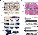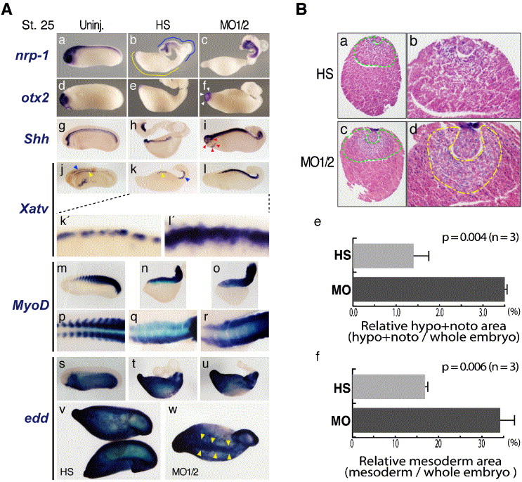 Fig. 6. Xatv is essential for proper formation of mesodermal tissues at later embryogenesis. Classical exogastrulae were induced by incubating embryos with high salt (HS) solution. XatvMO1 + MO2-injected embryos (30ng each) were incubated in 1Ã SS without vitelline membranes. When sibling embryos reached stage 25, exogastrulae were collected. (A) In situ hybridization. (aâc) nrp-1 expression. [Quantitative analysis of alterations shown: b, n = 4/5; c, n = 7/8.] Yellow and blue lines in panel b indicate the protruded mesendodermal mass and ectoderm, respectively. (dâf) Xotx2 expression. White arrowheads in panel f indicate the expanded prechordal plate in the anterior end. [Quantitation: e, n = 5/5; f, n = 9/9.] (gâi) Shh expression. Red arrowheads in panel i indicate the expanded prechordal plate in head mesoderm. [Quantitation: h, n = 8/11; i, n = 14/18.] (jâl) Xatv expression. [Quantitation: k, n = 5/7; f, n = 10/15.] Yellow and blue arrowheads in panel j: Xatv expression at the hypochord and neural tube floorplate, respectively. Yellow and blue arrowheads in panel k: Xatv signal at the dorsal mesendodermal mass and mesendodermal mass/ectoderm junction, respectively. (kâ², lâ²) Magnified views of panels k and l, respectively. (mâr) MyoD expression. [Quantitation: n, n = 6/6; o, n = 19/19.] (sâw) edd expression. Yellow arrowheads in panel w indicate the intense staining in axial mesoderm. [Quantitation: t, n = 9/9; u, n = 18/18.] (aâo, sâu) Lateral views, anterior left, dorsal upward. (pâr) Magnified dorsal view of panels mâo, respectively. (v, w) Dorsal views. (B) Histological morphology and relative volume of notochord + hypochord and mesodermal tissues in HS and XatvMO1 + MO2-induced exogastrulae. (aâd) Hematoxylin/eosin staining of exogastrulae after transverse sectioning (after whole-mount in situ hybridization for Xatv). Green dashed lines in panels a and c encircle the mesoderm area including somite and ventral mesodermal cells. (b, d) Magnified views of dorsal side of panels a and c, respectively. Yellow dashed line in panel d indicates the crescent-shaped tissue containing elongated cells and nuclei that are indicative of somitic muscle differentiation, which is less obvious within somitic mesoderm area in the HS-induced exogastrulae. (e, f) Comparison of the relative volume of hypochord + notochord area (e) and mesodermal area (f) between HS- and XatvMO1 + MO2-induced exogastrulae.
