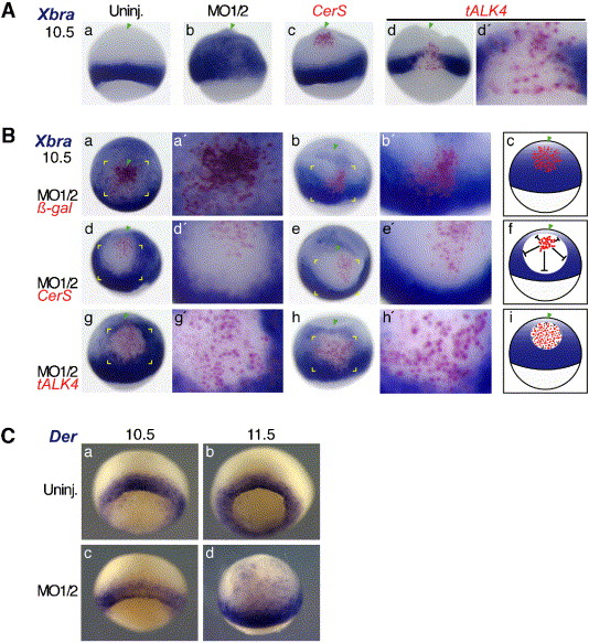 Fig. 7. Evidence for the expansion of Xbra expression by long-range Xnr signaling after Xatv knockdown. (A) In situ hybridization with Xbra on embryos at St. 10.5. (a) Uninjected embryo. (b) XatvMO1 + MO2-injected embryo. (c) CerS-injected embryos. (d) tALK4-injected embryo. (d′) High magnified view of panel d. (a–d) Lateral views. Red-gal staining in panels c and d detects the descendents of the cell injected with CerS and tALK4, respectively. (B) Xnr-specific inhibitors prevent ectopic Xbra expression in Xatv-deficient embryos. In situ hybridization on embryos at St. 10.5 detects Xbra expression, with red-gal staining detecting the descendants of the cell injected with RNA encoding the inhibitor (see text for detailed experimental design). Injection of β-gal (250 pg) does not affect ectopic Xbra expression (a–b′). CerS (500 pg) inhibits ectopic Xbra expression non-cell autonomously (d–e′), whereas tALK4 (500 pg) suppresses the ectopic Xbra expression cell autonomously (g–h′). (c, f, i) Simplified diagrams showing the effects on ectopic Xbra expression by β-gal, CerS, and tALK4, respectively. Red dots represent the clone of cells that express β-gal, CerS, and tALK4, respectively. “⊥” symbols in panels f and i show inhibition of Xnr signaling non-cell and cell autonomously by CerS and tALK4, respectively. (a, e) Animal views. (b, d, g, h) Lateral views skewed ∼45° animal-ward. (a′, b′, d′, e′, g′, h′) Magnified views of the yellow bracketed area of panels a, b, d, e, g, and h, respectively. Green arrowheads in panels A and B indicate animal pole. (C) In situ hybridization with Der in (a, b) uninjected and (c, d) XatvMO1 + MO2-injected embryos. Dorsal views, with (d) angled downward slightly to visualize the animal-ward extent of Der signal.