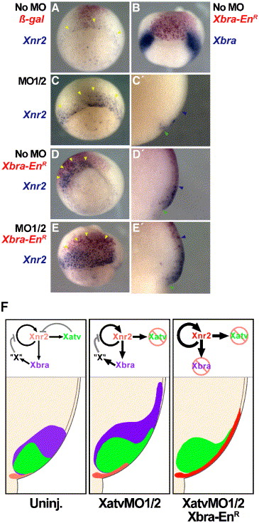 Fig. 8. Xatv and Xbra synergistically restrict the Xnr expression domain. Xbra-EnR RNA (1 ng) was injected ∼45° above the equator into one blastomere of 4-cell stage embryos that previously received 30 ng each of (XatvMO1 + XatvMO2) at the 1-cell stage. β-gal RNA (400 pg) was coinjected with Xbra-EnR RNA as lineage tracer. Xnr2 and Xbra expression was analyzed by in situ hybridization at St. 10.5 after red-gal staining. (A) Xnr2 expression, uninjected embryo. Red-gal staining indicates descendants of the β-gal-injected cell. (B) Xbra expression, Xbra-EnR RNA-injected embryo. (C) Xnr2 expression, XatvMO1 + MO2-injected embryo. (D) Xnr2 expression, Xbra-EnR RNA-injected embryo. (E) Xnr2 expression, XatvMO1 + MO2 and Xbra-EnR RNA-injected embryo. (C′, D′, E′) Embryos bisected through the center of the Xnr2 expression domain along animal-vegetal axis (from C, D and E). Green arrowheads, dorsal lip; blue arrowheads, anterior/animal boundary of Xnr2 expression; yellow arrowheads in panels A, C, D, E—approximate animal limit of Xnr2 expression domain. Note that Xnr2 expression remains in the superficial layer. Black print: injection or uninjection of XatvMO1 + MO2 (MO1/2); red print: reagents coinjected with the β-gal lineage tracer, except (A); blue print: probes used for in situ hybridization. (F) Model of synergistic Xatv/Xlefty and Xbra-mediated restriction of Xnr expression during gastrulation. Schematic diagrams represent dorsal midline-bissected stage 10.5 early gastrulae, showing internal expression domains of Xnr2 (red), Xatv (green), and Xbra (purple) in embryos that are (left) normal uninjected, (middle) Xatv/Xlefty MO1/MO2-coinjected, or (right) MO1/MO2 coinjected with Xbra-EnR. Increased line weight of arrows indicates elevated Xnr signaling, and increasing color intensity from light to dark red indicates increasing Xnr2 expression intensity. In normal embryos, Xnr2 expression is tightly restricted to the superficial layer of the dorsal lip (indentation), with Xnr–Xnr autoregulation maintaining this territory. Xnr2 restriction is accomplished by both Xatv and Xbra, activated by Xnr signaling diffusing from the Xnr2 expression domain. Primarily, Xatv inhibits Xnr expression non-cell autonomously. Xnr diffusing from producing cells activates expression of Xbra (purple) in both deep and superficial layers, which is stronger and earlier in the deep marginal zone compared to the superficial layer (see text). Rapid activation of Xbra provides an indirect repressive influence (Xbra is a transcriptional activator), implying that an unknown “Factor X” inhibits Xnr autoregulation, leading to the fixing of mutually exclusive expression domains for Xnr2 and Xbra. Knockdown of Xatv function using Xatv/Xlefty MO1 + MO2 allows limited expansion of Xnr2 expression, but elevated Xnr signaling range causes the massive expansion of Xatv and Xbra expression. Xnr2 expression is still restricted by the increased Xbra-mediated indirect suppression. Interfering with both Xatv and Xbra allows expansion of Xnr2 expression farther from the dorsal lip compared to either knockdown of Xatv or blocking Xbra function alone. Even in this condition, Xnr2 expression occurs only in the superficial layer.