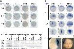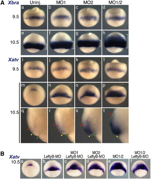 Supplemental Fig. 1. Synergistic effect on Xatv knockdown by coinjecting XatvA- and XatvB-specific MOs, with dramatic effects on Xnr target gene expression beginning from early gastrula onwards. (A) Embryos were injected with 60 ng of XatvMO1 or XatvMO2, or 30 ng each of (XatvMO1 + XatvMO2) at the 1-cell stage, and assayed at St. 9.5 and St. 10.5 by whole-mount in situ hybridization. Some embryos were bisected sagittally through the center of the dorsal lip before processing. MO-based depletion of Xatv did not change the expression level/domain of Xatv or Xbra at stage 9.5 (Aa–d, i–l). Expression of both genes was markedly upregulated and expanded in Xatv MO-injected embryos at stage 10.5 (Ae–h, m–t). Note that coinjecting XatvMO1 and XatvMO2 caused a more increased and expanded expression of markers than either single MO injection, suggesting a stronger knockdown of Xatv function. (a–p) Dorsal views, except (m) (vegetal view). (q–t) Sagittally bisected embryos. Green arrowheads, dorsal lip; red and yellow arrowheads show the distal and proximal boundaries of Xatv expression from the dorsal lip, respectively; white brackets, breadth of Xbra expression domain. [Quantitative analysis of alterations in MO-injected embryos shown: b, n = 10/10; c, n = 6/9; d, n = 6/8; f, n = 9/10; g, n = 8/10; h, n = 4/4; j, n = 8/8; k, n = 5/7; l, n = 3/4; n, n = 7/9; o, n = 8/10; p, n = 6/6; r, n = 5/5; s, n = 7/7; t, n = 6/6.] (B) Comparison of knockdown effect by several combinations of XatvMOs. Embryos were injected with 60 ng of (b) leftyB-MO (Branford and Yost, 2002), 30 ng of each of the pair of (c) XatvMO1+ leftyB-MO, (d) XatvMO2+ leftyB-MO, or (e) XatvMO1 + XatvMO2, or 20 ng of each of the three (f) XatvMO1 + XatvMO2 + leftyB-MO at the 1-cell stage, and assayed at St. 10.5 by whole-mount in situ hybridization. Coinjection of MOs that target the A and B copy of Xatv induce more expanded Xatv expression than injecting leftyB-MO alone (b; 55%, n = 20). MO combinations that inhibit both XatvA and XatvB function such as XatvMO1+ leftyB-MO (c; 73.7%, n = 20), XatvMO1 + XatvMO2 (e; 85%, n = 20), and XatvMO1 + XatvMO2 + leftyB-MO (f; 72.2%, n = 18) give rise to expanded Xatv expression at higher frequency than XatvMO2+ leftyB-MO that mainly targets XatvB function (d; 55%, n = 20).
