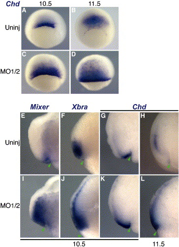 Supplemental Fig. 3. Expression of Chd, Xbra, and Mixer in XatvMO1 super + MO2-injected embryos. (A–D) Whole-mount in situ hybridization, Chd probe (dorsal views). During gastrulation, Chd expression is highly upregulated and expanded towards the animal side in XatvMO1 + MO2-injected embryos (C; n = 19/22, D; n = 15/17). (E–L) Comparison of the expression of organizer and mesendodermal markers. (E, F, I, J) Mixer and Xbra in situ hybridizations were performed with embryos after sagittal bisection through the center of the dorsal lip (I, n = 10/10; J, n = 9/10). (G, H, K, L) Embryos were sagittally bisected after whole-mount in situ hybridization, through the center of the Chd expression domain seen in panels A–D (green arrowheads indicate dorsal lip).