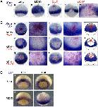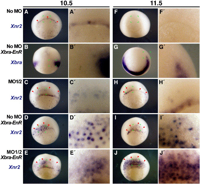 Supplemental Fig. 4. Xatv and Xbra synergistically regulate Xnr expression during gastrulation. The experimental method is the same as that in Fig. 8. To show more clearly the increased Xnr2 signal intensity caused by Xbra-EnR in the background of reduced Xatv/Xlefty function, the β-gal RNA injection and red-gal staining were omitted. Expression of Xnr2 and Xbra was analyzed by in situ hybridization at St. 10. 5 (A–E) and St. 11.5 (F–J). (A, C, D, E) Xnr2 expression at St. 10.5 after injecting the reagent combinations shown in black on the left side of the panels. All dorsal views, except (A) vegetal view, dorsal to the top. (B) Xbra expression at St. 10.5 after injecting Xbra-EnR. Dorsal view. (A′–E′) Magnified views of bracketed areas in panels A–E, respectively. [Quantitation: A, n = 18/20; B, n = 12/12; C, n = 20/20; D, n = 23/23; E, n = 21/22] (F, H, I, J) Xnr2 expression at St. 11.5 after injecting reagent combinations in black. Dorsal views, tilted upward. (G) Xbra expression, St. 11.5, after injecting Xbra-EnR. Vegetal view. (F′–J′) Magnified views of bracketed areas in panels F–J, respectively. [Quantitation: F, n = 19/19; G, n = 10/10; H, n = 19/19; I, n = 24/24; J, n = 27/31] Red arrowheads: animal limit of visible Xnr2 signal. The increased intensity of Xnr2 signal (punctate perinuclear staining) and expanded expression domain of Xnr2 in Xbra-EnR-injected embryos indicate that Xbra affects Xnr autoregulation at the transcriptional level (D, D′, E, E′). Xnr2 expression was expanded farther in MO1/MO2+Xbra-EnR-injected embryos with more elevated signal intensity than in the other conditions, demonstrating the multiple influences on Xnr expression by Xatv and Xbra (E, E′, J, J′). Note: The apparently minor effect on Xnr2 expansion between the MO1/MO2 + Xbra-EnR-injected condition compared to the MO1/MO2-injected condition (D and E, this figure), as compared to the greater expansion caused by Xbra-EnR in Fig. 8E may be caused by embryo batch-to-batch variation in response, which may be more noticeable during the dynamic mid-gastrula stage of patterning where the inputs on Xnr expression begin to have the most dramatic effects. In addition, the embryo represented in panel E may be slightly earlier than the one shown in Fig. 8E; analysis of later stage 11.5 embryos (F–J) clearly shows a much greater effect on intensity and domain of Xnr2 expression at this stage (compare panels H and I to panel J).