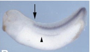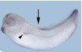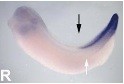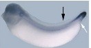 hoxd9 (homeobox D9) gene expression in Xenopus laevis embryo, assayed via in situ hybridization, NF stage 20, lateral view, anterior left, dorsal up.