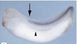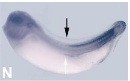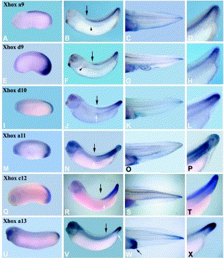 Fig. 2. Xenopus AbdB-type Hox genes have specific domain of expression along the anteroposterior axis. Black and white arrows indicate the anterior limit of gene expression in the CNS and the paraxial mesoderm, respectively. Black arrowheads indicate anterior limits in the kidney. First column: expression pattern at stage 20 with the exception of U, which is a stage 26 embryo. Second column: stage 32. Third column: stage 39. Fourth column: detail of expression in the tail bud at stage 32. (AâD) Xhoxa9; (EâH) Xhoxd9; (IâL) Xhoxd10; (MâP) Xhoxa11; (QâV) Xhoxc12; (UâX) Xhoxa13, arrow in W points to the expression in the most distal part of the hindgut.