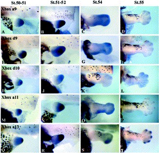 Fig. 5. Xenopus AbdB-type Hox gene expression in the developing limbs. The anterior of the whole body is to the left. With the limb buds in normal orientation this means that for the buds the anterior is down, posterior is up and dorsal is facing the viewer.