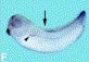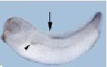 hoxd9 (homeobox D9) gene expression in Xenopus laevis embryo, assayed via in situ hybridization, NF stage 51/52, hind limb buds in normal orientation- anterior is down, posterior is up and dorsal is facing viewer.