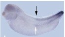 hoxa9 (homeobox A9) gene expression in Xenopus laevis embryo, assayed via in situ hybridization, NF stage 32, lateral view, anterior left, dorsal up.
