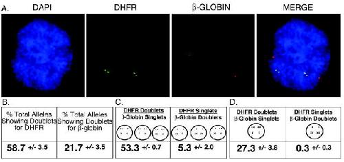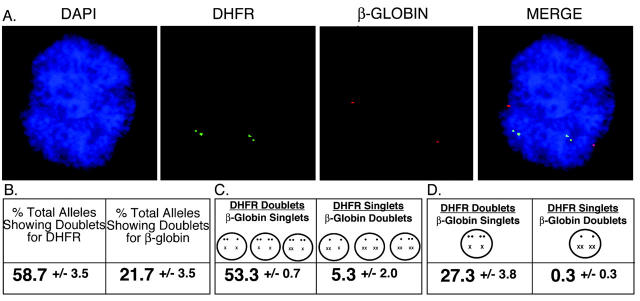Figure 1. Relative replication timing of DHFR and β-globin loci. (A) Asynchronously growing CHO cells were pulse labeled with BrdU and hybridized in situ with digoxigenin-labeled DHFR cosmid cSc26 and biotin-labeled β-globin phage λJHC2. Sites of hybridization were visualized with FITC-conjugated antidigoxigenin antibodies (DHFR, green) and Texas red avidin (β-globin, red). BrdU label was detected with AMCA-labeled anti-BrdU antibodies (blue). In the image shown, BrdU foci are not visible because nuclei were additionally stained with DAPI (blue) to highlight the entire nucleus. (B–D) The number of DHFR and β-globin singlets and doublets per nucleus was evaluated. (B) The percentage of total alleles scored that displayed doublets for each locus was calculated. (C) The percentage of nuclei that displayed more doublets for one locus than the other was calculated. (D) The percentage of nuclei that showed doublets for both alleles of one locus and singlets for both alleles of the other locus was calculated. (C and D) Schematic representations of the arrangement of the DHFR (dot) and β-globin (x) alleles are included. The mean values ± SEM are shown for three independent experiments in which >100 BrdU-positive nuclei each were scored. All sets of data in this report include hybridizations in which both DHFR and β-globin probes were labeled with both biotin and digoxigenin and used in either combination, to control for any differences in labeling and detection of different nucleotide analogues. Only nuclei showing clear signals for both DHFR and β-globin loci were scored.