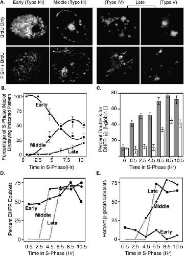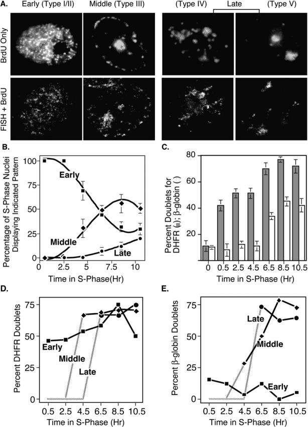 Figure 2. The CHO β-globin locus is replicated during the stage of peripheral DNA synthesis. (A) Examples of early (type I/II), middle (type III), and late (type and type V) replication patterns, revealed by pulse labeling CHO AA8 cells with BrdU and staining with fluorescent anti-BrdU antibodies. (Top) Shows cells fixed with ethanol and stained only for anti-BrdU, as described (Dimitrova and Gilbert, 1999b). (Bottom) Shows the pattern of anti-BrdU staining with cells that were first subjected to FISH. Conditions used for FISH distort the pattern of BrdU staining; however, it is still possible to distinguish the different pattern types. (B) CHO AA8 cells were synchronized in mitosis and released into medium containing aphidicolin to accumulate cells at the G1/S border. Cells were then released from the G1/S block, pulse labeled with BrdU at various times thereafter, and stained with anti-BrdU antibodies as in A (top). Shown are the percentage of BrdU-positive cells that exhibited early (▪), middle (▴), or late (•) replication patterns at each time point. (C) Aliquots of the same cells from B were hybridized with β-globin and DHFR probes by FISH, and the percentage of doublet alleles for each locus was determined. Results in B and C show the means ± SEM (when >2) for three independent experiments in which >100 nuclei each were scored. (D and E) Cells synchronized as in B were subjected to FISH with either a DHFR (D) or β-globin (E) probe and subsequently stained with anti-BrdU antibodies as in A (bottom). The percentage of doublet alleles was scored as a function of the early (▪), middle (▴), or late (•) BrdU patterns. The dashed lines for middle- and late-replication patterns indicate the time of appearance of these patterns during S phase (i.e., middle patterns first appeared between 2.5 and 4.5 h, and late patterns first appeared between 4.5 and 6.5 h).