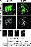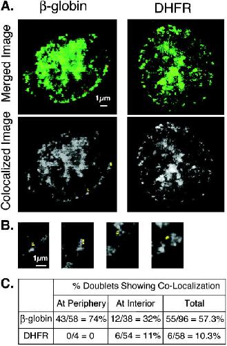 Figure 3. Colocalization of β-globin versus DHFR doublets with sites of DNA synthesis during middle to late S phase. CHO AA8 cells pulse labeled with BrdU were subjected to FISH with either a β-globin or a DHFR probe (red) and then stained with anti-BrdU antibodies (green). Analysis was concentrated on nuclei that displayed type III or IV BrdU patterns (described in legend to Fig. 2). (A) (Top) Show examples of merged confocal images. (Bottom) Show the same images after computer-assisted colocalization analysis. After background subtraction, those pixels still showing colocalization of red and green signals were colored in yellow, whereas pixels showing no colocalization were colored in white. (B) Sections of the nuclear periphery from exemplary nuclei showing the proximity of β-globin doublets to the peripheral heterochromatin. (C) The percentage of doublets within type III and IV nuclei that colocalized with BrdU signal was scored. Data were scored independently for doublets found either at the periphery (defined as <1 μm from the edge of DAPI staining) or the interior of the nucleus.