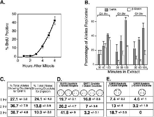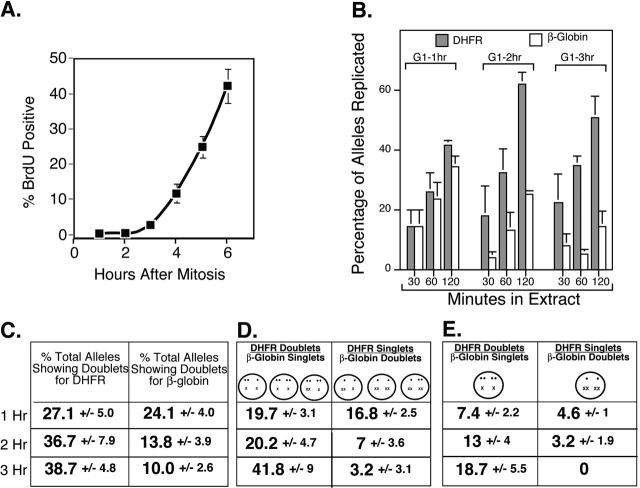 Figure 4. Late replication of the β-globin gene locus in CHO cells is established 1–2 h after mitosis. (A) CHO AA8 cells were synchronized in mitosis and released into G1 phase. At the indicated times thereafter, cells were pulse labeled with BrdU, stained with anti-BrdU antibodies, and the percentage of BrdU positive nuclei was scored. (B) Nuclei isolated either at 1, 2, or 3 h after mitosis were introduced into Xenopus egg extracts. Aliquots of these nuclei were then subjected to FISH analysis at 30, 60, and 120 min thereafter. The percentage of total DHFR or β-globin alleles displaying doublets was calculated for >100 nuclei per time point. Shown are the means ± SEM for three independent experiments. (C–E) Results shown in B for 30, 60, and 120 min in vitro were averaged together and displayed by the same three methods described in the legend to Fig. 1, B–D.