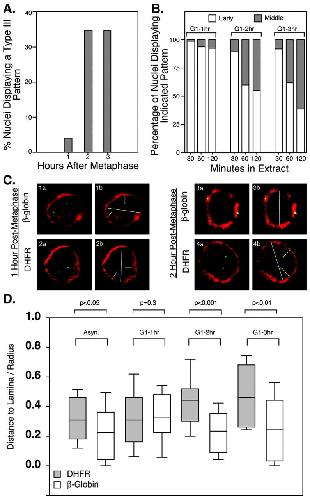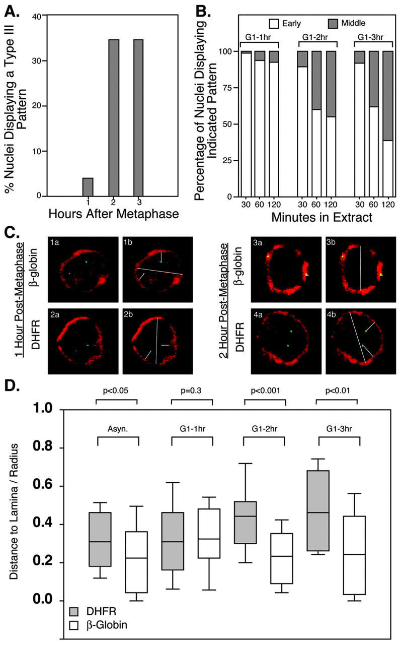 Figure 5. The repositioning of type III sequences and the peripheral localization of the β-globin locus are completed 1–2 h after mitosis. (A) Asynchronous cultures of CHO AA8 cells were pulse labeled with BrdU for 30 min. Metaphase cells were harvested 3.5 h thereafter, creating populations of cells in which late-replicating sequences were tagged with BrdU (∼1/3 of which were type III). At 1, 2, and 3 h after release into G1 phase, cells were fixed and stained with anti-BrdU antibody, and the percentage of nuclei displaying a type III spatial pattern, represented by peripheral and nucleolar BrdU staining, was calculated. (B) Nuclei were isolated from CHO AA8 cells synchronized at 1, 2, or 3 h after mitosis and introduced into Xenopus egg extracts. At the indicated time points, reactions were pulse labeled in vitro with biotin-11-dUTP, and nuclei were stained with Texas red streptavidin. The percentage of nuclei from each time point that displayed either early (many internal punctate foci) or middle (peripheral and nucleolar DNA synthesis) replication patterns was calculated. (C and D) Asynchronously growing cultures (Asyn.), as well as cells synchronized at 1, 2, or 3 h after metaphase, were subjected to FISH with DHFR or β-globin probes and then stained with an anti-lamin A/C antibody. Confocal images were collected and the distance from each allele to the nuclear lamina was measured and divided by the radius of the nucleus at its widest point. (C) Examples of images found for either DHFR or β-globin at either 1 or 2 h after mitosis. A copy of each image is shown to its immediate right, with white lines to denote the measurements taken for the diameter and the shortest distance from the FISH signal to the nuclear envelope. The lamina was used as an indicator of the nuclear periphery rather than DAPI (as in Fig. 1) due to the occasional invaginations of the nuclear envelope that are not always detectable with the use of DNA dyes. An example of such an invagination is shown (2, a and b). Two β-globin alleles at the periphery, appearing as yellow FISH foci, which would be scored as a distance of zero, are also shown (3a and 3b). (D) Box plot representing the shortest distance between DHFR or β-globin alleles and the nuclear lamina. Data for each cell population were collected from ≥37 nuclei. Horizontal bars represent the 10th, 25th, 50th (median), 75th, and 90th percentiles, and the p-values for each pair of samples are shown. This type of plot indicates that 50% of the population is found between the 25th and 75th percentiles, and is represented as a box. Gray boxes denote DHFR alleles, and white boxes denote β-globin alleles.