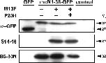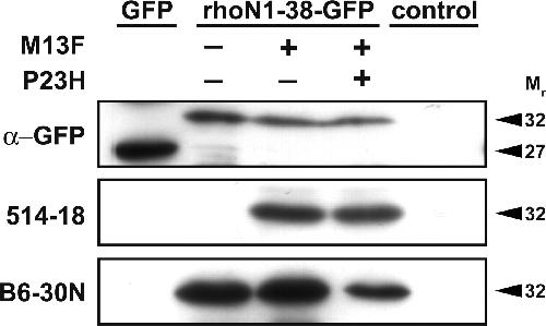 Effects of M13F on antibody cross-reactivity. Western blots of extracts of COS cells transfected with plasmids designed to express GFP or rhodopsin N1-38–GFP fusion proteins or mock-transfected cells (control) are shown. Blots were probed with antibodies B630N, 514-18, or anti-GFP. Mr, Relative mobility.