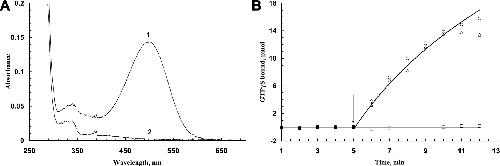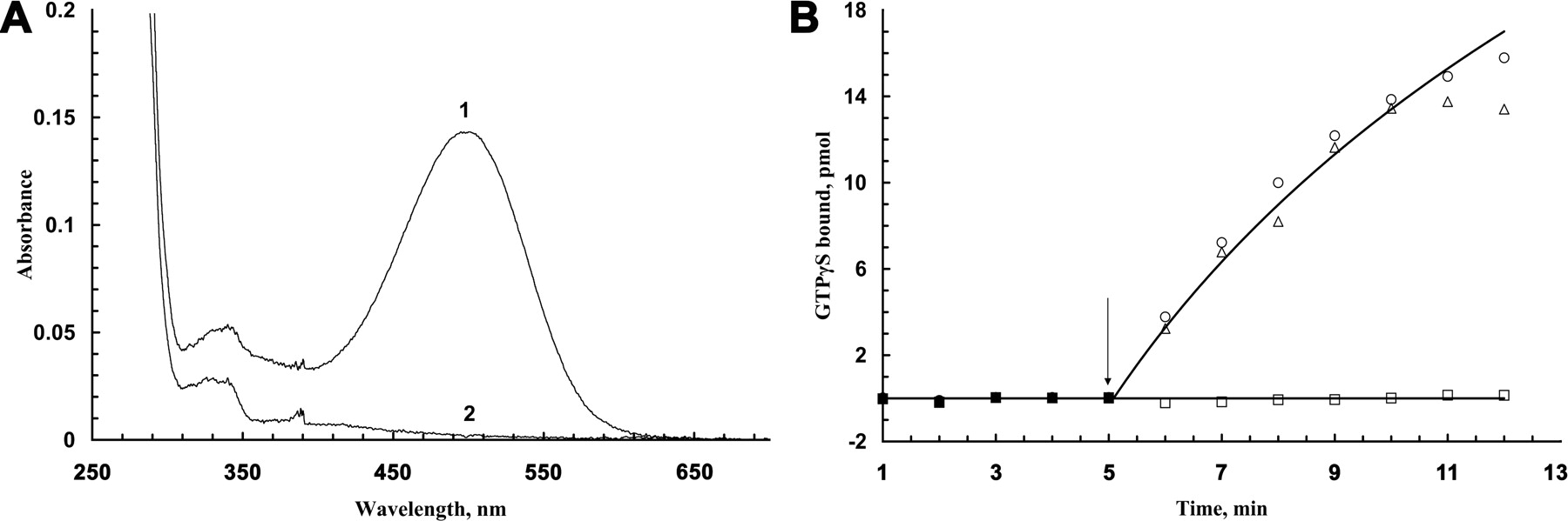 Characterization of the effects of rhodopsin mutations on chromophore formation and transducin activation. A, Absorption spectra for mutant rhodopsins purified from COS cell detergent extracts. Spectra are for the mutants eRho (1) and eRhoK296R (2). B, Effect of rhodopsin mutations on ability to activate transducin. Filled symbols, Dark; open symbols, after exposure to light (arrow). Circles, eRho; triangles, eRhoQ350Ter; squares, eRhoK296R. ERhoK296R membranes that were not treated with retinal were also assayed for ability to activate transducin but showed no activity (data not shown).