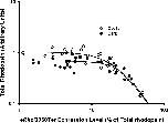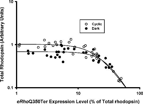 Effect of dark rearing on total rhodopsin content of eRhoQ350Ter transgenic eyes. Dot blots of total eye extract from 33 animals of each type were probed with B630N (total rhodopsin) and 514-18 (transgenic rhodopsin) as in Figure 3, and plots of expression level versus total rhodopsin were similarly derived from the dot blots and fit to dose–response curves. Note that the greatest difference in rhodopsin content occurs at the lowest expression levels.