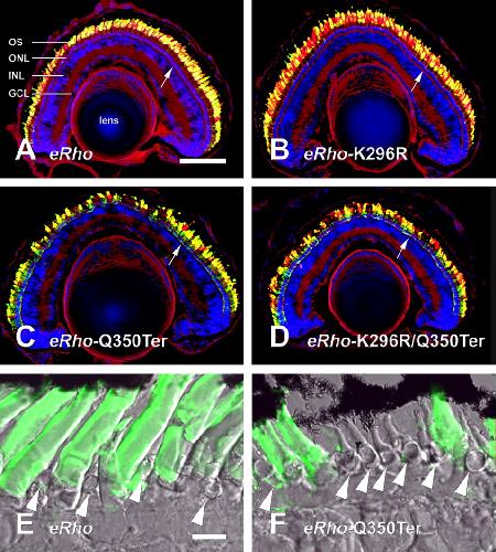 Effects of transgene expression on rod and cone photoreceptor density. A–D, Confocal micrographs of retinas expressing high levels of eRho (A), eRhoK296R (B), eRhoQ350Ter (C), and eRhoK296R/Q350Ter (D) labeled with 2B2 anti-eRho rhodopsin (green), wheat germ agglutinin (red), and Hoechst 33342 nuclear stain (blue). Note the gaps in the photoreceptor layer in C and D. E, Section of retina expressing eRho, with bright-field image superimposed on 2B2 label. F, Similar section expressing eRhoQ350Ter. Note the absence of rods relative to E. Cones are present in the spaces between rods (arrowheads). Mislocalized rhodopsin is present in the rod synapses in C, D, and F (compare regions marked by white arrows to similar regions marked in A, B, and E). Scale bars: (in A) A–D, 100 μm; (in E) E, F, 10 μm. ONL, Outer nuclear layer; INL, inner nuclear layer; GCL, ganglion cell layer.