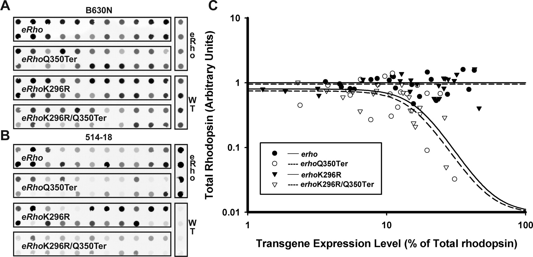 Dot blot analysis of the effects of rhodopsin expression on total rhodopsin content of transgenic eyes. Dot blots of total eye extract from 22 transgenic animals of each type probed with B630N (total rhodopsin) (A) and 514-18 (eRho rhodopsin) (B) are shown. The positions of four control samples of wt and eRho rhodopsin are indicated on each blot. The ratio of 514-18 signal to B630N signal was used to calculate the percentage of transgenic rhodopsin in each eye. C, Plots of expression level versus total rhodopsin. The log scale data for eRhoQ350Ter and eRhoK296R/Q350Ter were fit to dose–response curves, and eRho and eRhoK296R data were fit to straight lines.