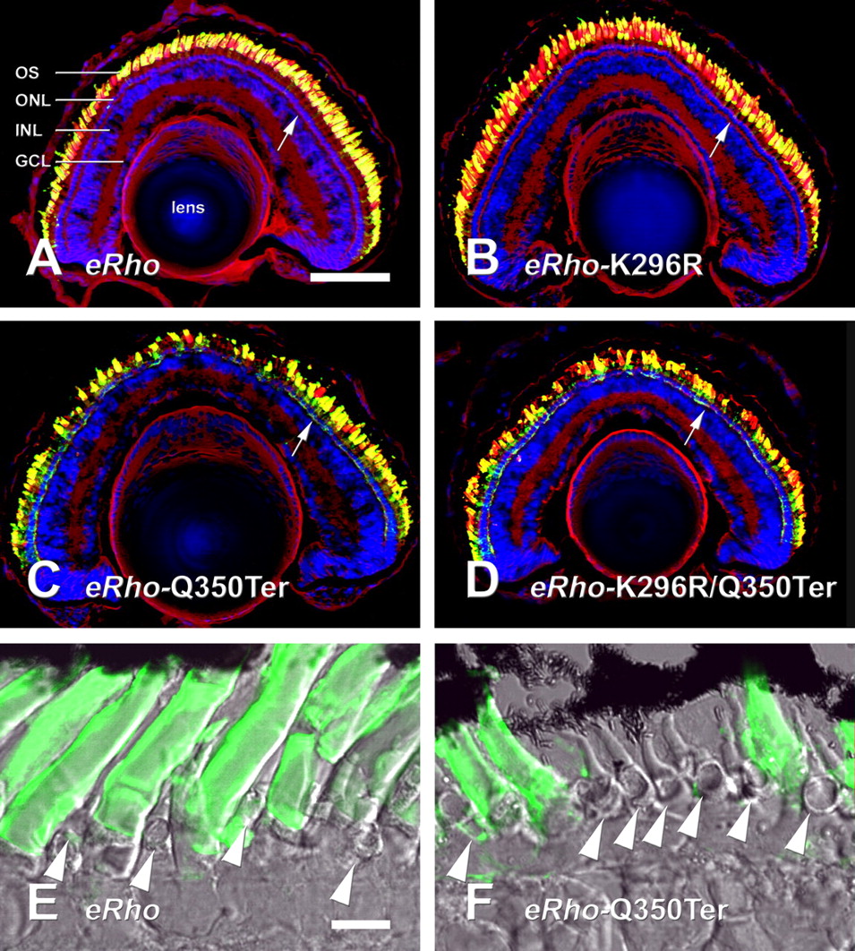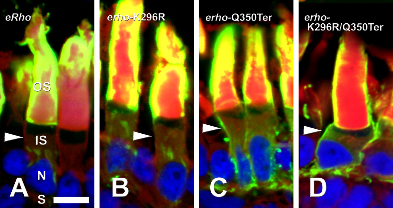 Localization of transgene products in rod photoreceptors. Retinas were labeled with 2B2 anti-eRho rhodopsin (green), wheat germ agglutinin (red), and Hoechst 33342 nuclear stain (blue) Rods are expressing eRho (A), eRhoK296R (B), eRhoQ350Ter (C), or eRhoK296R/Q350Ter (D). Note the strong 2B2 signal from IS plasma membranes in C and D relative to A and B (arrowheads). The asymmetric labeling of OS is an artifact caused by poor penetration of the densely packed disk membranes in fixed tissue. Scale bar, 10 μm. N, Nucleus; S, synapse.