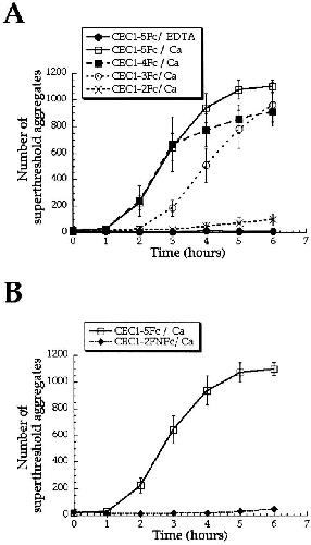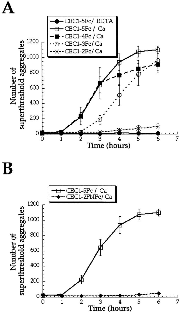 Figure 4. Basic homophilic binding activity of cadherin mutants assessed by bead aggregation assay. (A) Full-length and COOH-terminal EC domain deletions: CEC1-5Fc, CEC1-4Fc, CEC1-3Fc, and CEC1-2Fc. (B) Analysis of CEC1-2 with spacers inserted: CEC1-2FNFc compared to CEC1-5Fc. The number of aggregates of coated microspheres large enough to be detected by a Coulter counter is plotted as function of time. Samples were incubated in the absence of calcium (EDTA) or in the presence of calcium (Ca). The experiment was performed with at least three different batches of protein and the mean ± SEM is shown.
