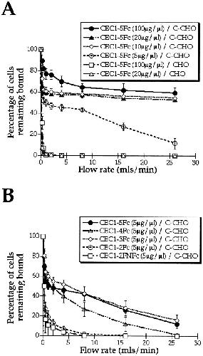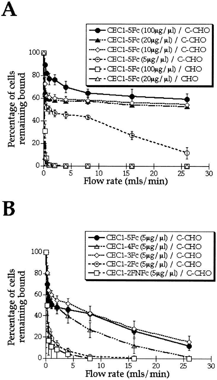Figure 5. Adhesive activity of C-cadherin mutants assessed by a cell detachment assay. The adhesive strength is measured by the resistance of cell detachment under a laminar flow from surfaces coated with chimeric proteins. (A) Adhesion of CHO cells expressing C-cadherin (C-CHO cells) to CEC1-5Fc at different concentrations of CEC1-5Fc (100, 20, 10, and 5 μg/μl). The construct was attached to the tube surface via protein A, and the cells were allowed to bind to the substrate under static conditions. The flow was subsequently increased every 30 s, and the number of cells remaining within the field of view was counted. Assays were performed in the presence of calcium using C-CHO cells or control CHO cells. (B) Adhesion of C-CHO cells to surfaces coated with CEC1-5Fc, CEC1-4Fc, CEC1-3Fc, CEC1-2Fc (two different clones), and CEC1-2FNFc, all at 5 μg/μl. The experiments were performed in triplicate and the mean ± SEM is shown.