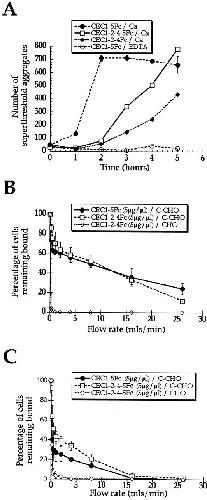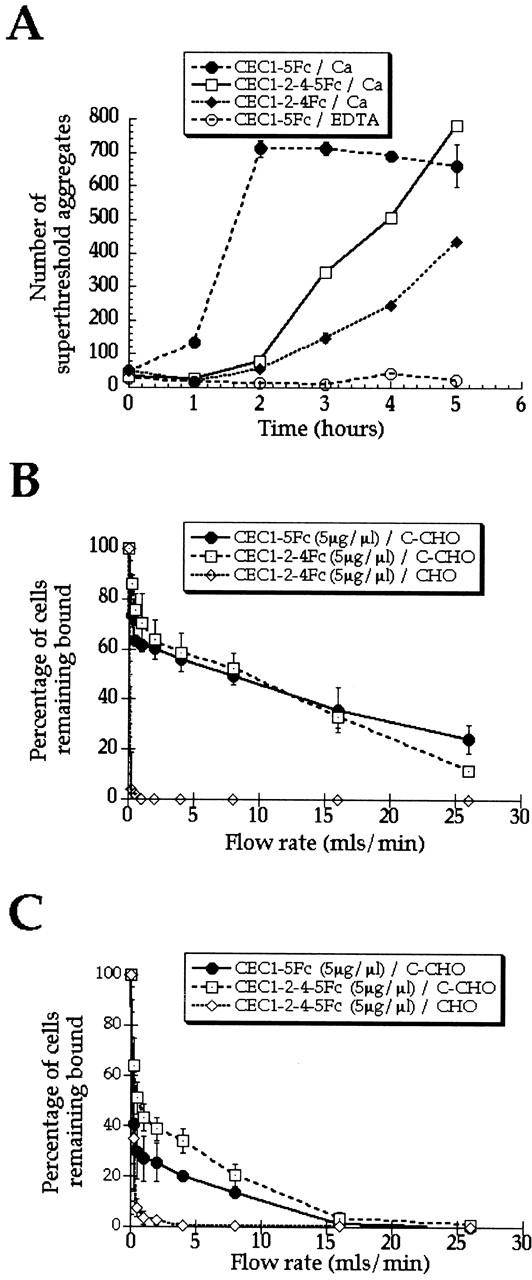 Figure 6. Homophilic binding and cell attachment activities of constructs lacking the EC3 domain: CEC1-2-4Fc and CEC1-2-4-5Fc. (A) Bead aggregation assay using a Coulter counter as described in the legend to Fig. 4. (B and C) Analysis of adhesion to chimaeric proteins using the laminar flow assay as described in Fig. 5. Adhesion of C-CHO cells to CEC1-2-4Fc (B) and CEC1-2-4-5Fc (C) compared with CEC1-5Fc, all at 5 μg/μl. The experiments were performed in triplicate and the mean ± SEM is shown.