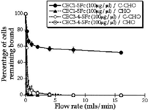Figure 7. Lack of adhesion activity of a construct lacking EC domains 1 and 2 (CEC3-4-5Fc) by laminar flow assay. Attachment of C-CHO cells to high concentrations of CEC3-4-5Fc (100 μg/μl) compared with CEC1-5Fc. The experiment was performed in triplicate and the mean ± SEM is shown.