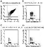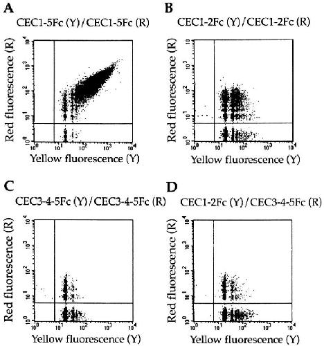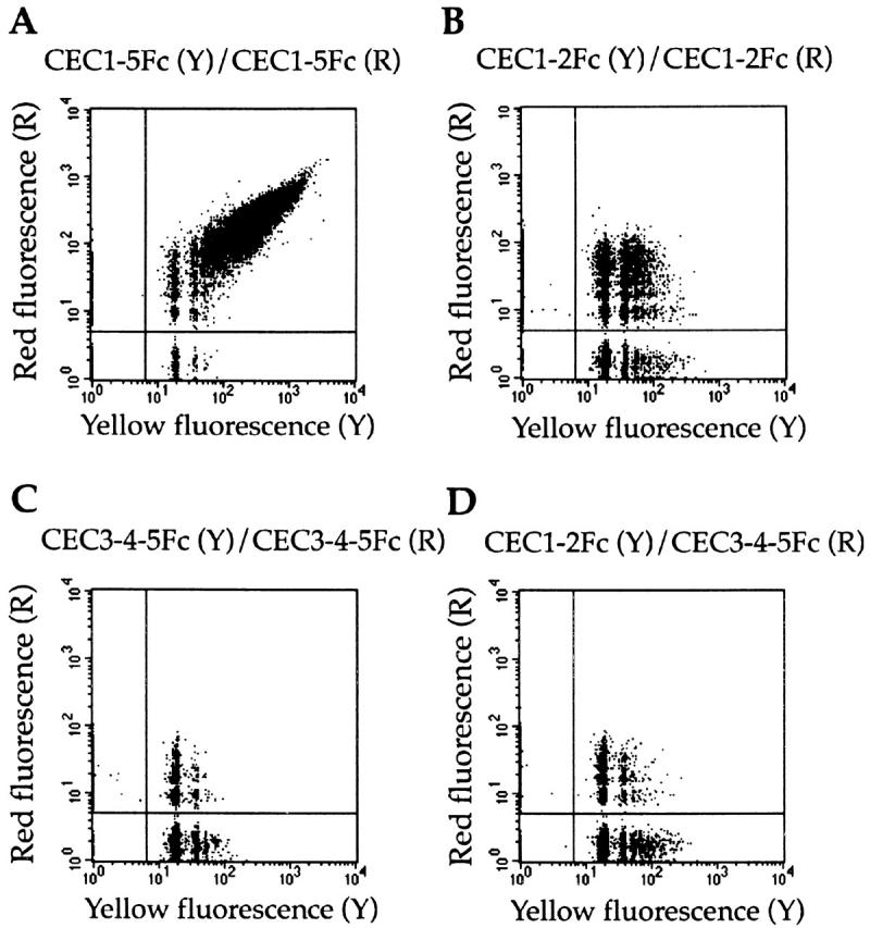 Figure 8. Mixed bead aggregation assay to assess homophilic binding activity between different cadherin mutants. Flow cytometry was used to detect and quantify mixed aggregates formed between yellow fluorescent beads (Y) and red fluorescent beads (R) coated with different cadherin EC constructs. Mixed aggregates appear in the region to the right of and above the lines drawn on the graph. (Yellow only singlets and small aggregates appear in the lower right region, but red only singlets and small aggregates do not appear on the graph because they lie on the y axis.) (A) Analysis of aggregation between CEC1-5Fc on both sets of beads. (B) Analysis of aggregation between CEC1-2Fc on both sets of beads. (C) Analysis of aggregation between CEC3-4-5FC on both sets of beads. (D) Analysis of aggregation between CEC1-2Fc–coated yellow beads and CEC3-4-5FC–coated red beads.