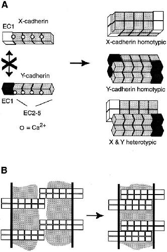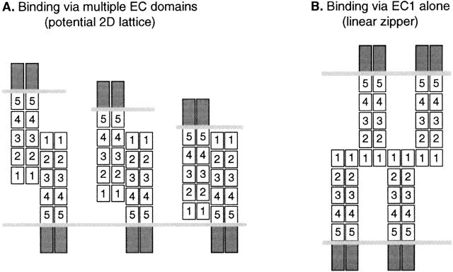 Figure 9. Model of adhesive bond formation via the extracellular cadherin repeats. (A) Binding via multiple EC domains, as demonstrated in this study. If binding sites have different orientations, cadherin dimers could form two-dimensional lattices (not shown). (B) Linear zipper model for the homophilic bond via the EC1 domains alone, as proposed in Shapiro et al. (1995).