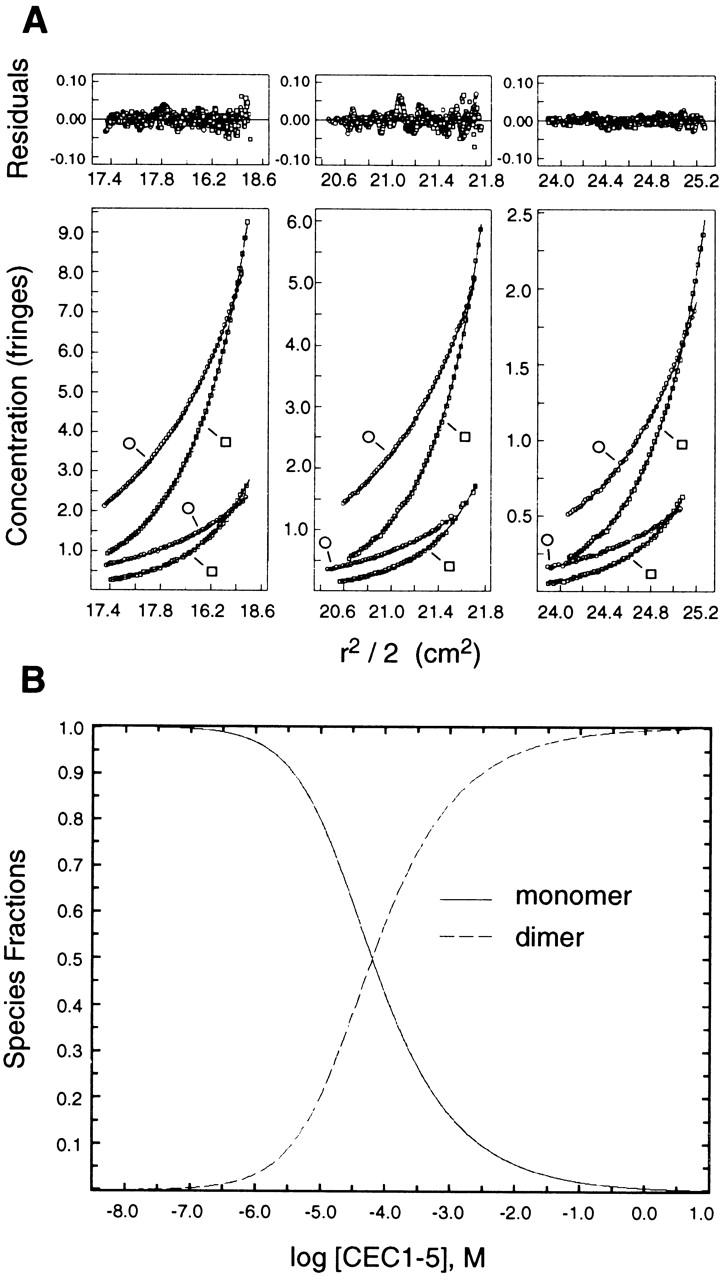 Figure 1. Sedimentation equilibrium analysis of the soluble C-cadherin ectodomain (CEC1-5). (A) Sedimentation equilibrium data. (Bottom) Show global fit of data collected at six loading concentrations ranging from 2–25 μM and rotor speeds of 10,000 rpm (○) and 14,000 rpm (□) to a monomer–dimer self association model. Symbols represent measured data points, and solid lines represent theoretical fits to the model. (Top) Illustrates the deviations of the measured points from the theoretical fit lines. (B) Plots illustrating expected fractions of monomer (solid line) and dimer (dashed line) at different CEC1-5 concentrations, calculated using the Kd(1-2) of 64 μM determined by the global fit of the sedimentation equilibrium data to a monomer–dimer association model.