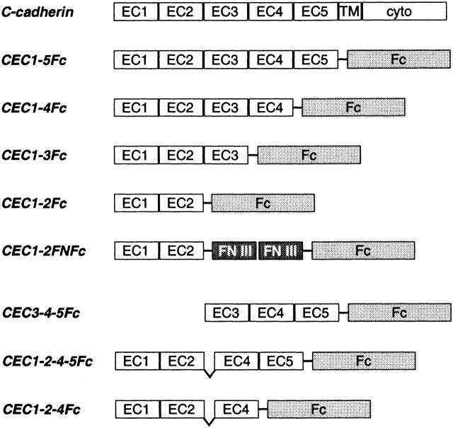 Figure 2. Schematic representation of Xenopus C-cadherin and the chimeric Fc fusion proteins. Full-length C-cadherin molecule consists of the ectodomain (five EC domains), transmembrane region (TM) and the cytoplasmic tail (CP). CEC1-5Fc consists of the ectodomain fused to the Fc part of the human IgG (Fc). Domains were expressed as Fc chimaeras to force dimerization, since dimerization of C-cadherin was shown to be crucial for adhesive function. CEC1-4Fc, CEC1-3Fc, and CEC1-2Fc consist of successively fewer number of cadherin repeats fused to Fc at the COOH terminus. CEC3-4-5Fc consists of the ectodomain deleted from the NH2-terminal region fused to Fc at the COOH terminus. CEC1-2FNFc consists of the first two domains fused to the two fibronectin type III repeats of the chicken N-CAM (FN III), still having Fc as the COOH-terminal region. CEC1-2-4Fc consists of successively domains 1-2 and 4 fused to Fc at the COOH terminus and on the same scheme CEC1-2-4-5Fc of domains 1-2 and 4-5.