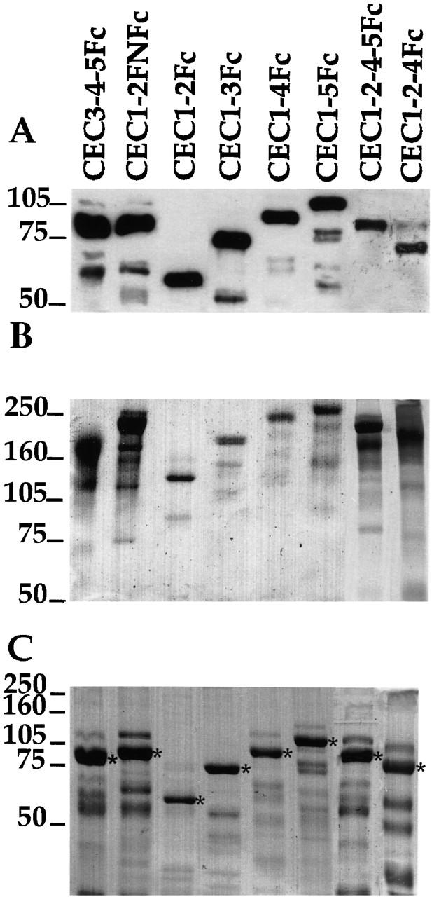 Figure 3. Expression and purification of the mutant cadherin proteins secreted from transfected CHO cells. (A) Western blotting of purified proteins with an anti–human Fc; (B) Coomassie staining of purified proteins on a non reducing gel; (C) Coomassie staining of purified proteins separated by an 8% reducing gel. *Indicate processed mature full-length protein as confirmed by NH2-terminal sequencing.